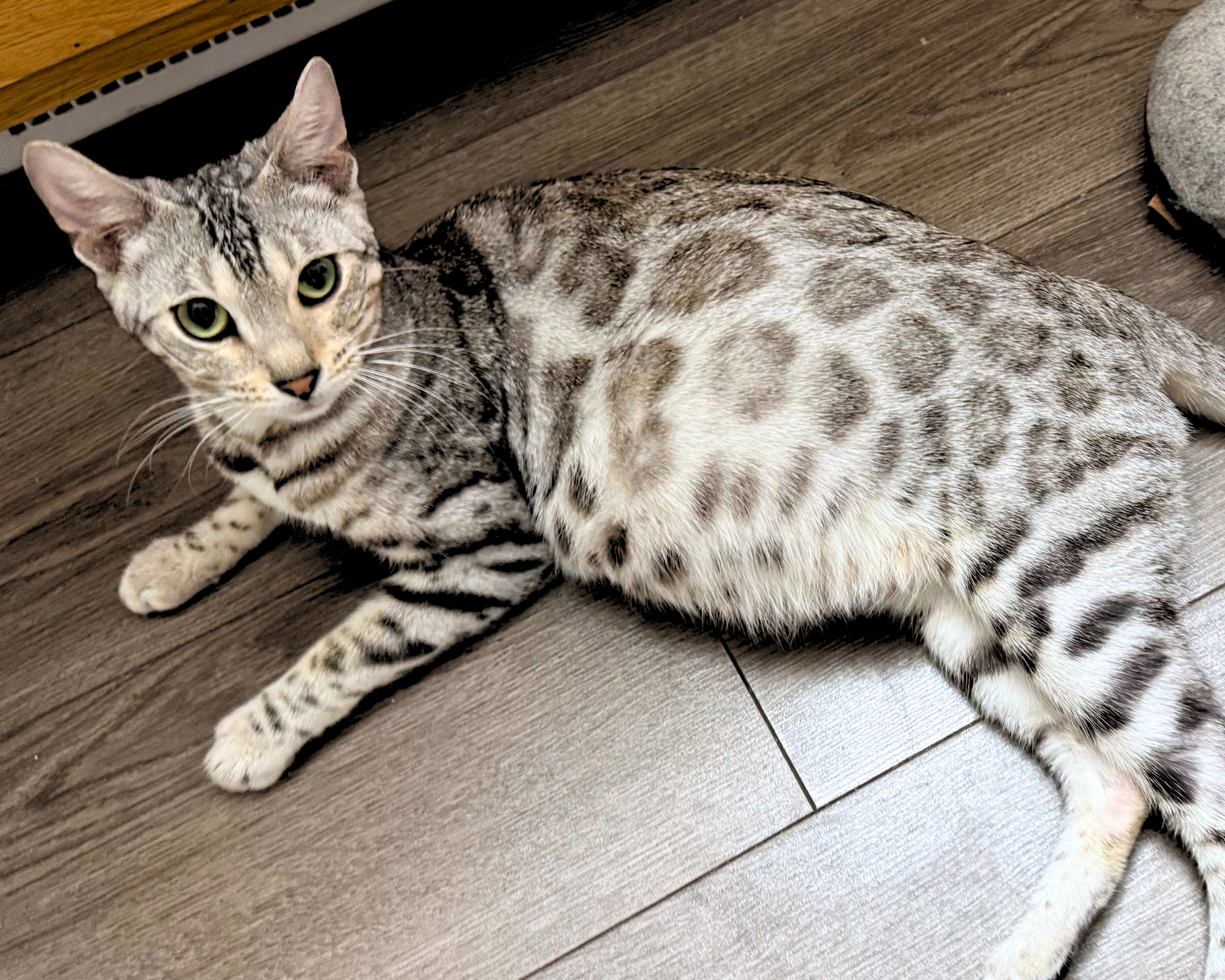 Stella Mae is a beautiful silver queen with striking rosettes and a vibrant personality to match. She carries the glitter gene, giving her coat a lovely shimmer, and brings warmth and presence to our household.