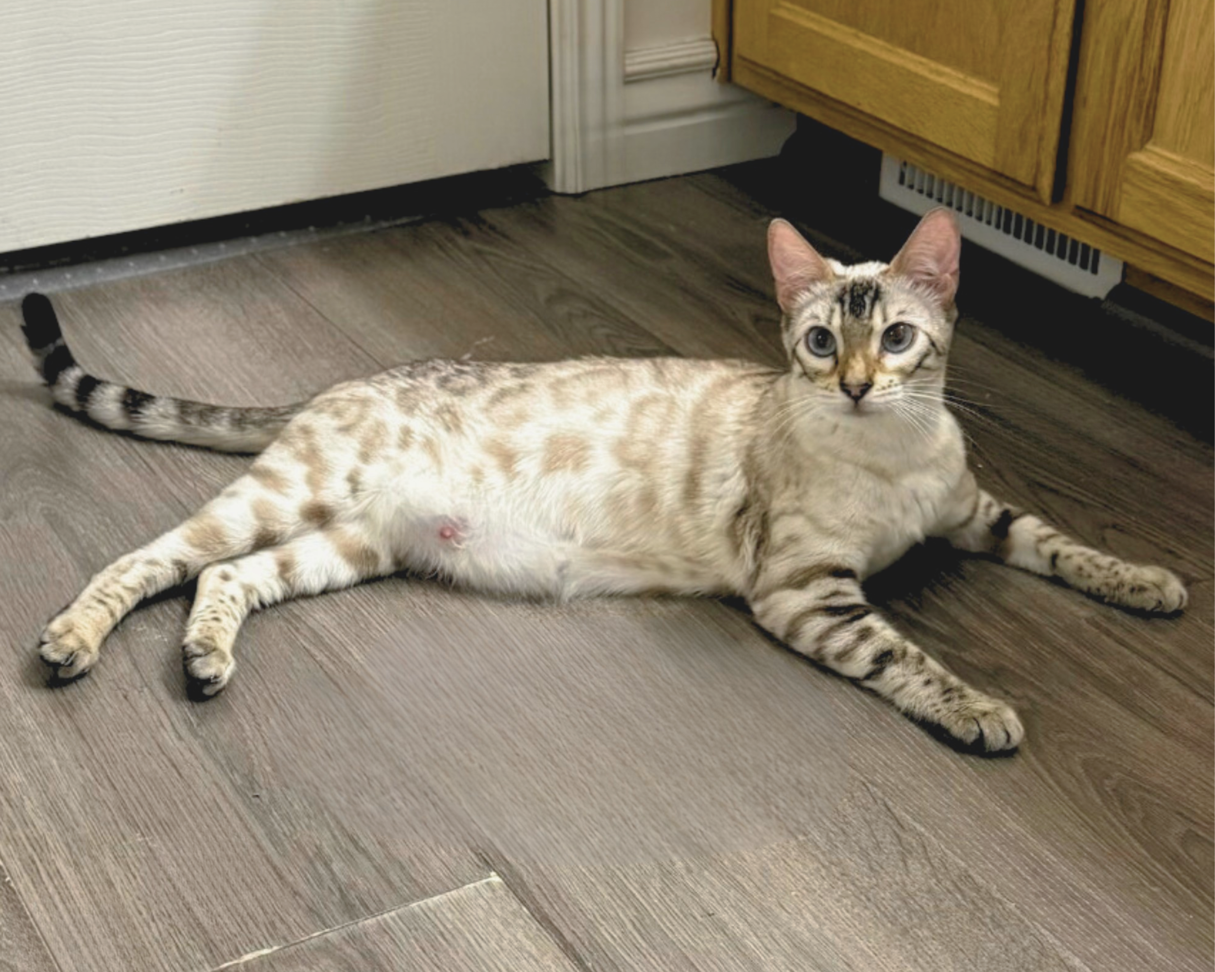 Mischa is a Russian Snow Lynx Bengal with a gentle, calm, and quiet personality. She has a peaceful presence that brings a sense of serenity to our home. Her striking pattern showcases beautiful clouds and rosettes that have deepened and developed beautifully as she's matured.